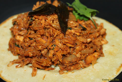 • Now add the cooked chicken, using a wooden fork or spoon shred the chicken while constantly stir frying it.
