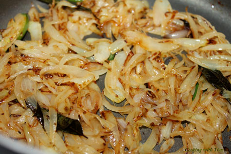 • Heat a cast iron skillet or wide skillet, add oil, onion, curry leaves and saute until the onion turns golden brown.