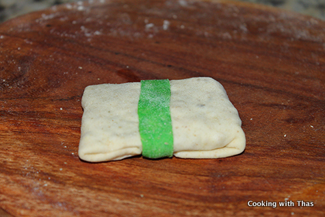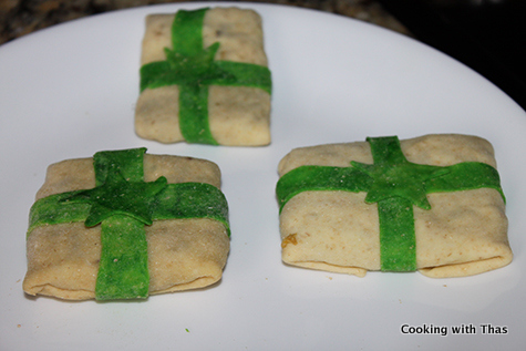 I used the chicken masala that I usually make for stuffing samosas. Also, I used both wheat and white flour to make the dough. For making the ribbon, I dyed the dough with green as I only had that colour in my pantry. You could use any colour of your choice, red would look really good. On the center of the ribbons I placed a star, you can use any shapes: heart shapes, flowers etc.