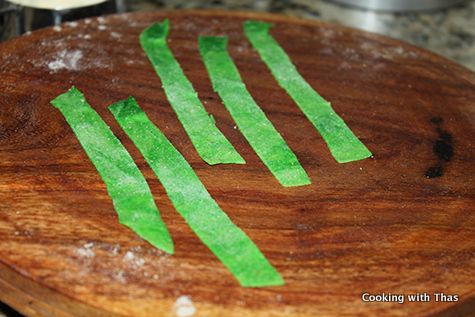 - Using a sharp knife, cut into long strips or ribbons of equal lengths, keep aside.