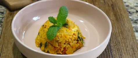 - To a plate, flip the bowl over so the upma will fall nicely onto the plate in the shape of a dome, this will make a beautiful presentation, garnish with mint or cilantro leaves.