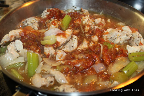 - Before the pan gets hot, add the chicken, onion, celery, garlic chopped along with dried oregano, dired basil, ground pepper and salt.
