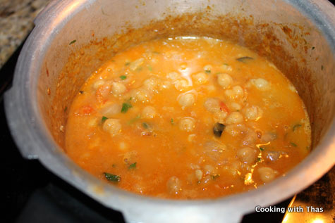 - Add the cooked chickpeas along with 1/4 cup water and cook in the cooker till 1 whistle.