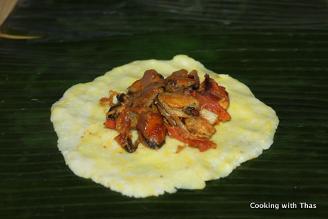 I’ve mentioned many times in my blog about my deep love for mussels and for all shell fish, I feel satiated when I say that over and over. My favorite way of devouring mussels are by frying them, so for making the mussel roast I first shallow fried the mussels and made the roast with it. I used rice flour seasoned with some spices to make the dough. Stuffed the dough with the mussel roast and wrapped it in a banana leaf. Steamed the dumplings in a bamboo steamer for about 5 minutes.