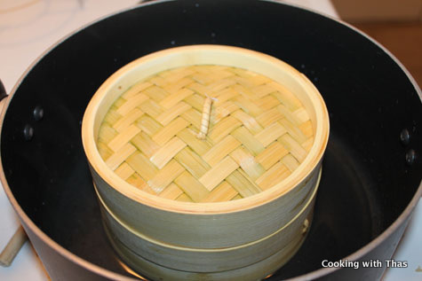 - Place the bamboo steamer over the hot water and let it steam cook for about 6 minutes.