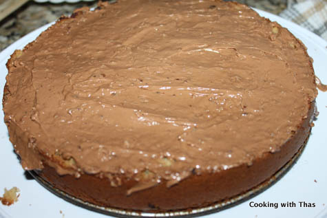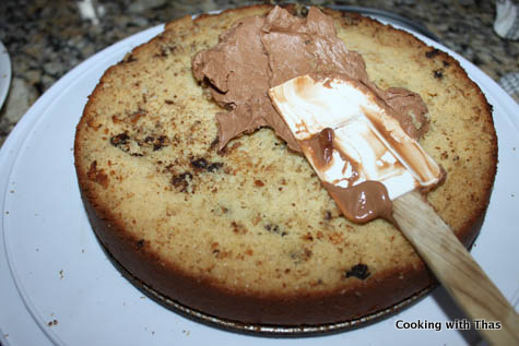 - Spread the chocolate frosting all over the cake and even it out using a spatula.