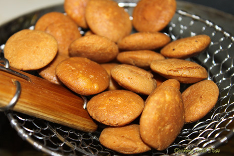 - Deep fry the button shaped dough in enough oil until golden brown and inside is cooked through.