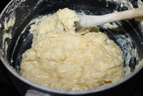 After adding the flour beat it vigorously using wooden spoon till the dough forms a ball and pulls aways from the pan. Break any lumps that's formed.