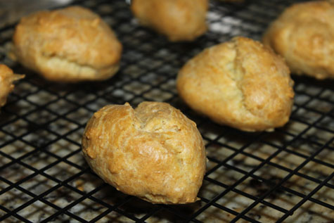 - Remove from cookie sheet and let cool on a cooling rack. Prick the side of each puff with the tip of a fork to release steam.