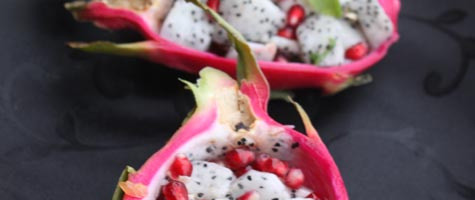 - In a bowl, combine diced dragin fruit, pomegranate, clementine or orange juice and mint leaves.