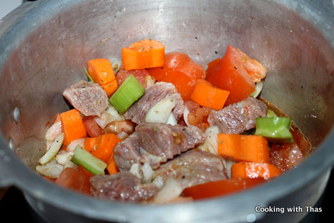 Place the pressure cooker over medium heat and place the whistle on it.- Cook until 3 whistles. If your pressure cooker doesn’t have whistle cook the beef for about 30 minutes.