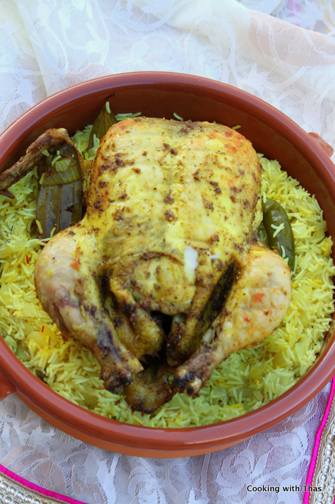 The spice rub used to marinate the chicken is called Hawaij– coriander seeds, cumin seeds, cardamom, cloves, cinnamon, whole black peppercorns are roasted till aromatic and made into a powder. Very few and very basic spices are used for making this dish. The chicken was marinated for 3 to 4 hours and then slow cooked in the oven on a wire rack placed over the rice pot. By this method, the dripping from the chicken would fall over the rice and both the rice and the chicken would be cooked at the same time.