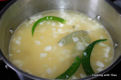 - Add whole cardamom, cloves, cinnamon, bay leaves, pepper corns, green chilies, turmeric powder, rice, water and enough salt. Combine well.