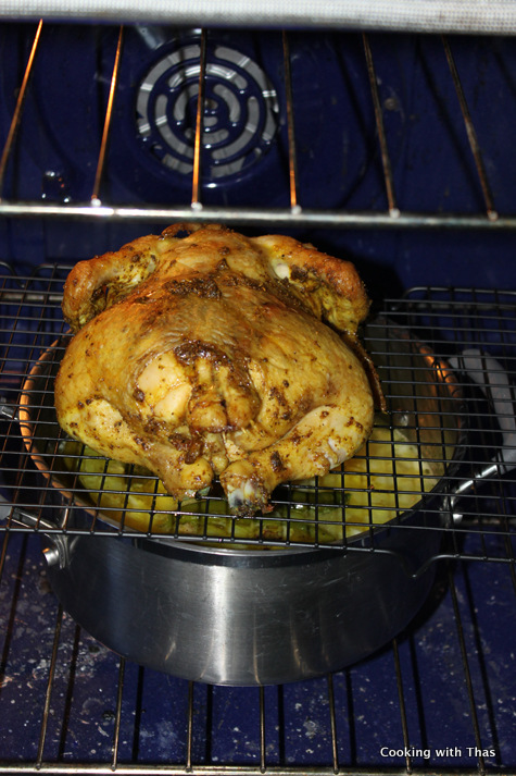 - After an hour, gently flip the chicken (breast side up) and again cook for another 45 minutes or till the chicken has browned and cooked well inside.