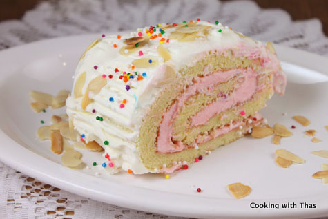 I used chocolate whipped cream frosting to spread on the cake and to frost the swiss roll. Drizzled the swiss roll with chocolate ganache.