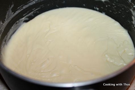 - Pour the condensed milk and vanilla extract over the melted chocolate chips and combine well.