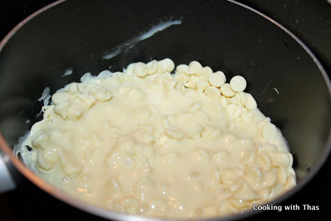 - Melt the remaining 1/4 cup of white chocolate chips in a double boiler.
