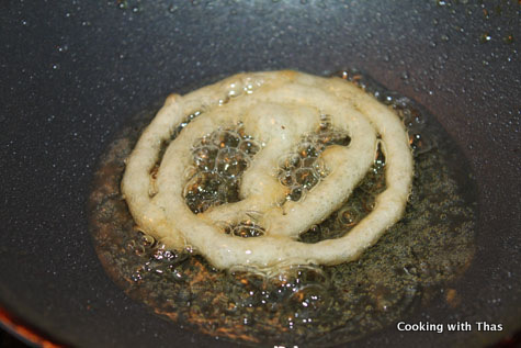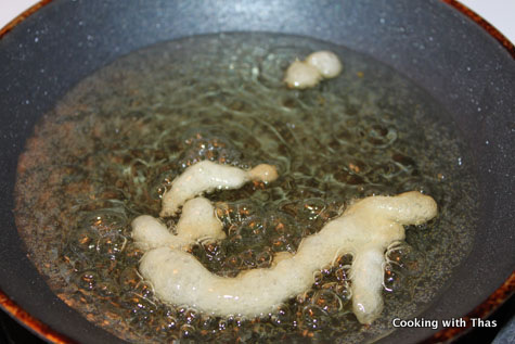 - When the oil has turned hot, squeeze the batter from the bottle or bag in a circular motion into the hot oil.
