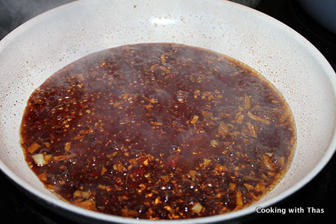 - Add rice vinegar and chili paste, combine well and let the sauce come to a slight boil.