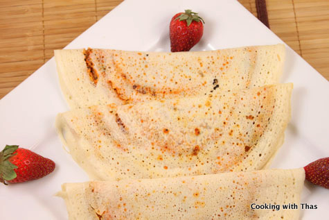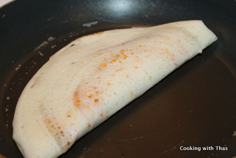 - Fold the dosa over and flip to the other side, cook for a minute.