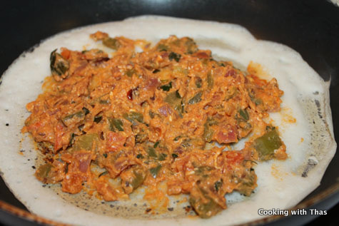 - Spread the egg masala evenly over the dosa, let cook for a few seconds.
