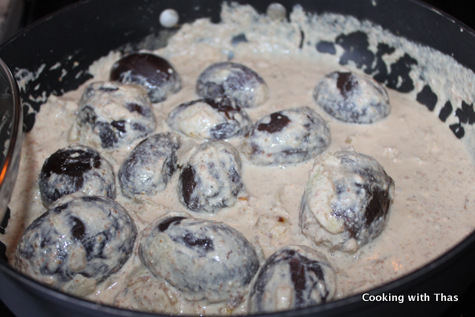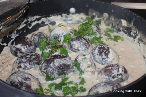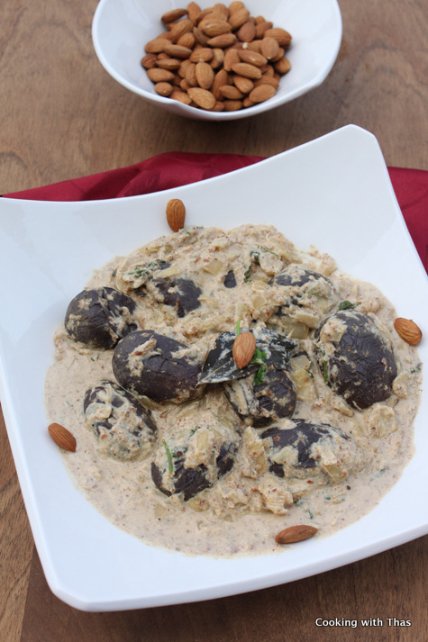 - Now, add the cooked eggplants into the almond sauce and cook covered for 10 to 15 minutes.
