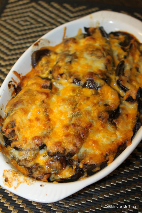 • After 20 minutes, turn on the broil to low heat and place the baking dish on the top rack, broil for 30 to 45 seconds till cheese turns golden in color.