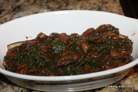 • As the second layer, spread half of the mushroom-spinach sauce over the eggplant layer.