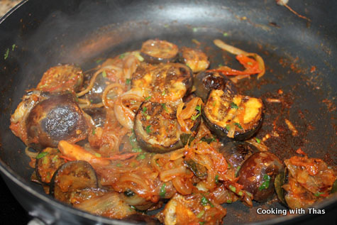 - Place a large non-stick pan over medium heat, add 3 tbsp oil, place the marinated eggplants in oil and pan fry it till it turns golden brown in color. If you prefer you could deep fry the eggplants.