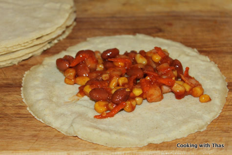 - Place one tortilla on your cutting board, place 2 tbsp of the prepared filling over it.