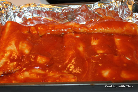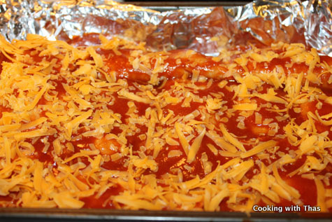 - Pour the rest of the sauce evenly over the rolled tortilla.