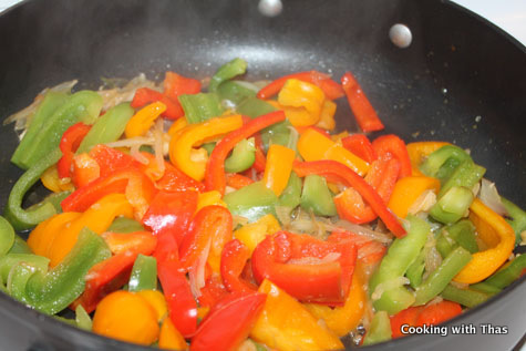- Add all the peppers and cook till they turn tender but not fully cooked or mashed up.