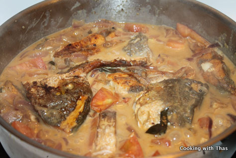- Now, pour the thick coconut milk, gently mix it without breaking the fish and let it simmer for a few minutes.