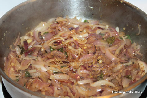 - Add onions and curry leaves along with little salt to the oil, saute till onions starts to turn translucent.