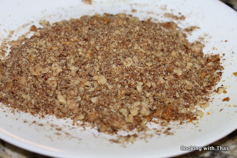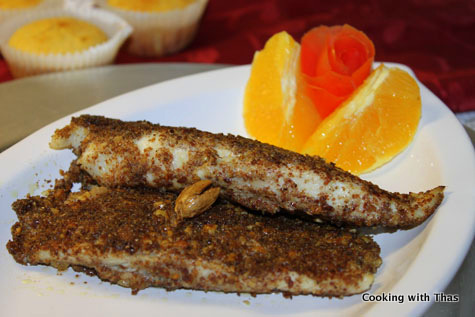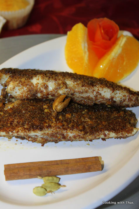 Had it not been for my tastebuds which always want something different I wouldn’t have made variety dishes. I literally cannot settle for same kind of dishes, even if I make the same dish I would make some alterations. There are only a few dishes which I make in the same way always. When it comes to fish, I like tilapia as it’s very mild and doesn’t have that intense fishy smell. I often bake it, roast it, fry it o make curries out of it. Last week, I made this flaxseed-walnut crusted tilapia, I would say this is the best way of making tilapia. Seasoned tilapia was coated with ground flaxseeds/walnuts and pan fried in oil infused with cinnamon and cardamom. This couldn’t get any better, hands down the best tasting tilapia.