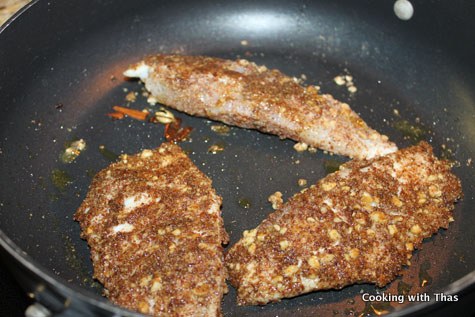 - Place the coated tilapia over the oil and pan fry till both sides turn light golden in color.