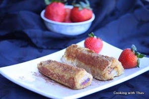 I made a simple version, smeared the bread with strawberry jam and placed some freshly chopped strawberries on the bread, rolled it up and dipped in beaten egg and fried in butter till golden brown. This turned out delish, both kids and adults will indulge in this. This can be served for weekend breakfast, brunch or even as an evening snack.