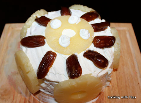 - Place round cut pineapples (canned) over the cake, and on the sides of the cake.