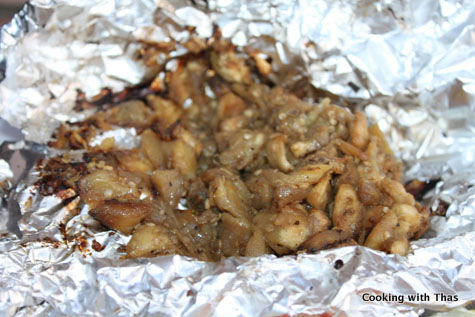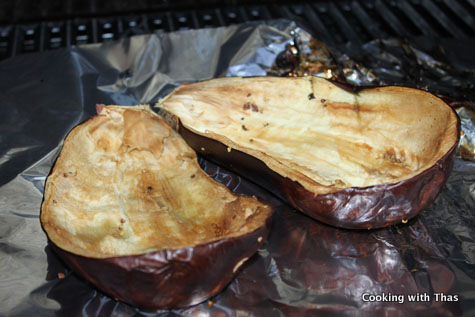 - Cover the eggplant with aluminum foil and place on the grill. Let grill for a few minutes till it turns tender and remove from the grill.