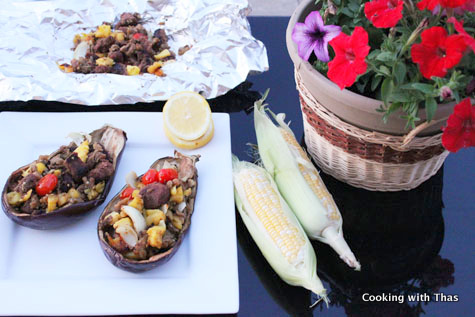 My refrigerator was packed with veggies and fruits. I picked eggplant, pineapple, onions, cherry tomatoes and beef stew for grilling. First, I made a really good marinade for the beef stew, it was jalapeno-pineapple marinade. Grilled the beef to perfection, combined with grilled eggplant, pineapple and veggies and served over grilled eggplant skin.