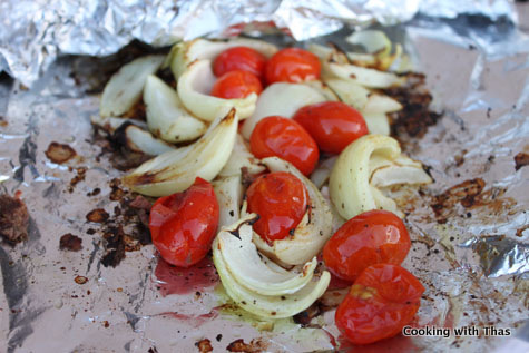 - After everything has grilled, drizzle tomatoes and onions with 1 tbsp olive oil.