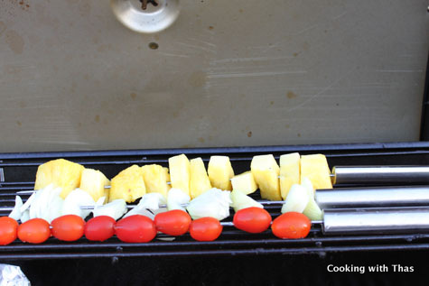 - Skewer the pineapple, onions and tomatoes, place on the grill where there is low flame or on the upper rack, you don't want to burn them. Grill till the pineapple and veggies turn light brown in color.