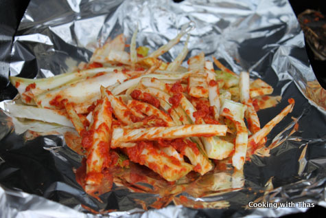 - Place the marinated fennel on an aluminum foil, place the aluminum foil on the grill, cover the grill and grill for a few minutes till it has turned tender.