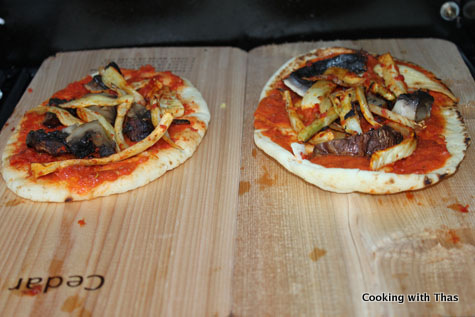 I had already mentioned that my latest obsession has been sun dried tomatoes. It’s such a versatile ingredient, throw it into anything and it would make that dish taste remarkable. For making pizza sauce, I pureed sun dried tomatoes (in olive oil and herbs). I also marinated a few large brown mushrooms and fennel with the sun dried tomato paste. Grilled the veggies and topped them on the naan pizza and topped with cheese. Placed the naan on the cedar plank and grilled it for a few minutes. Since it’s grilled pizza, I needed the grill mark on the pizza, so after grilling it on the plank, I then placed the pizza or naan pizza to be precise directly on the grill (low flame) for couple of minutes and there I had the grill marks. Tasted absolutely delicious, sun dried tomato sauce gave a very distinct and nice aroma and flavor to the pizza. Grilled mushrooms and fennel were so delicious.