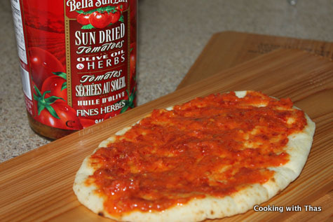 - Spread the naan evenly with rest of the sun dried tomato paste.