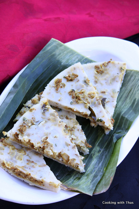 - Cover the pan with aluminum foil and steam cook for 25 to 30 minutes or until the rice batter has cooked well.