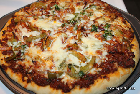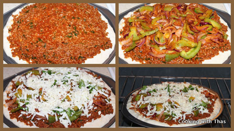 When it came to top the pizza crust, I went a little overboard and made ground beef sauce.Topped the crust with the ground beef and then with veggies, generously sprinkled mozzarella cheese and baked it in the oven for 20 minutes. For the entire 20 minutes, I literally peeped into the oven window and enjoyed the amazing show of crust puffing up, ground beef getting browned and the cheese getting melted, what a divine pleasure it was!!!