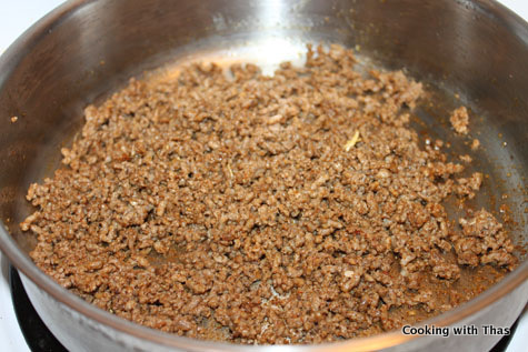 - Add the ground beef and break the lumps, cook till the pink color has changed.