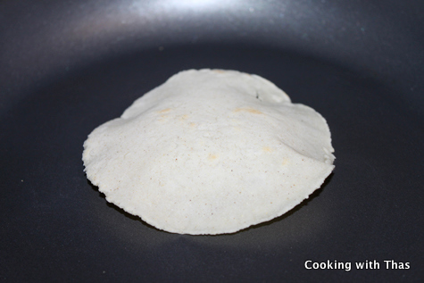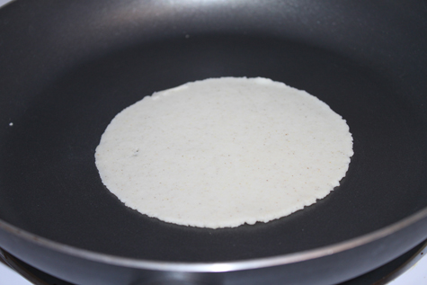 • Place the flattened dough on to the hot pan and let cook for 20 seconds.