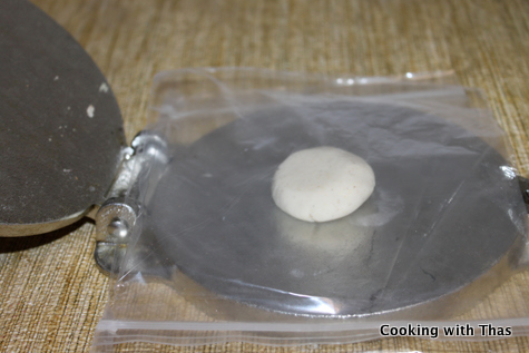 10. If you don't have the tortilla press, Using a rolling pin, flatten the dough ball in between the plastic sheets into a round shape, as thin as you can make it without tearing.